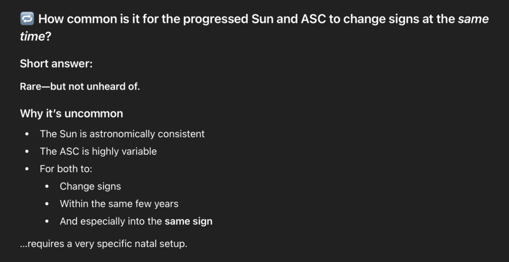 Because of my ASC AND SUN SIGN both shifting into a new sign (which is Taurus BTW and obviously the 1st house) I got a little curious and wanted to know how common it was for this to happen. That is when I went to Chat GPT to see what would come up, and this is what it had to say:
