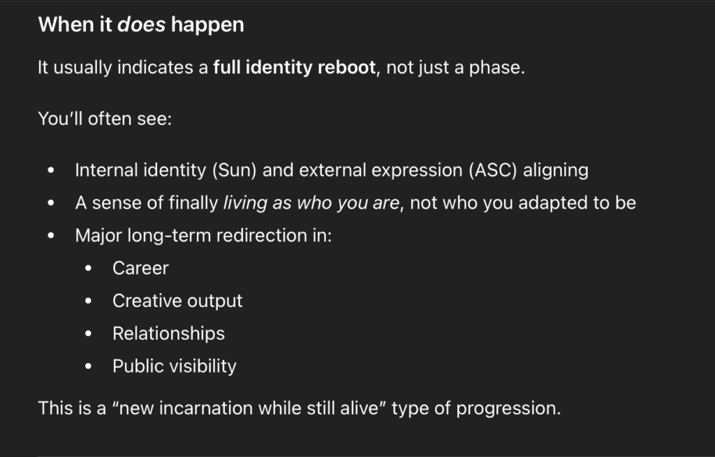 A progressed Sun sign change marks a major life chapter shift, not a mood or phase; it often coincides with identity restructuring, career, or role changes, shifts in how you generate purpose and vitality. It’s one of the most consequential progression events you can have.